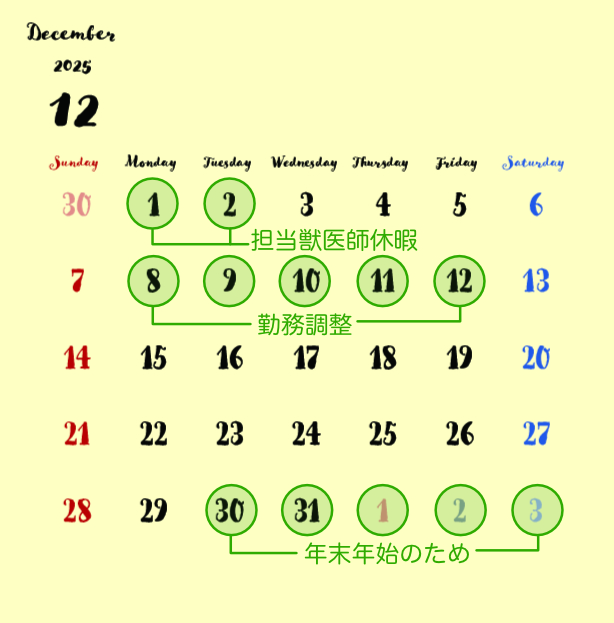 ・12/8(月)~12(金) 出張 のため、他の獣医師の対応となります。