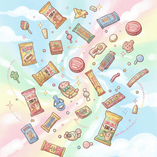 Firefly_GeminiFlash_色んな種類の駄菓子が広がって舞っているイラスト 751132