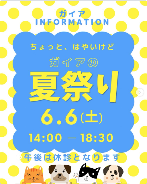 いつも当院をご利用頂きありがとうございます🙇♀️ ペットさんとのおでかけやお散歩が暑くなる前に、飼い主様と楽しめるガイアプチ夏祭りを開催致します✨️